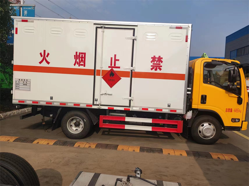 三、上裝配置: 廂體采用雙層復(fù)合板結(jié)構(gòu):外板為δ1.2mm冷軋鋼板,貨廂內(nèi)蒙皮為δ1mm鋁板,中間為矩形管架焊接固定和B1級阻燃隔熱材料填充,貨廂側(cè)壁設(shè)置具有防雨功能的通風窗,廂體外部四周采用鋁合金型材包邊,貨廂底板為δ3mm的鋼板;貨廂內(nèi)可選裝固定貨物的臥環(huán)或卡槽;設(shè)置對開后貨廂門,可選裝側(cè)門,貨廂門密封條為具有防雨防塵的密封條;貨廂內(nèi)底板鋪設(shè)阻燃導(dǎo)靜電膠板;貨廂內(nèi)設(shè)置貨物起火燃燒報警裝置,貨廂門上設(shè)置防盜報警裝置;危險品運輸車標配:靜電帶、安全告示牌、危險品牌、反光標示及警告標志、滅火器、危險品三角頂燈、排氣管火花熄滅裝置。