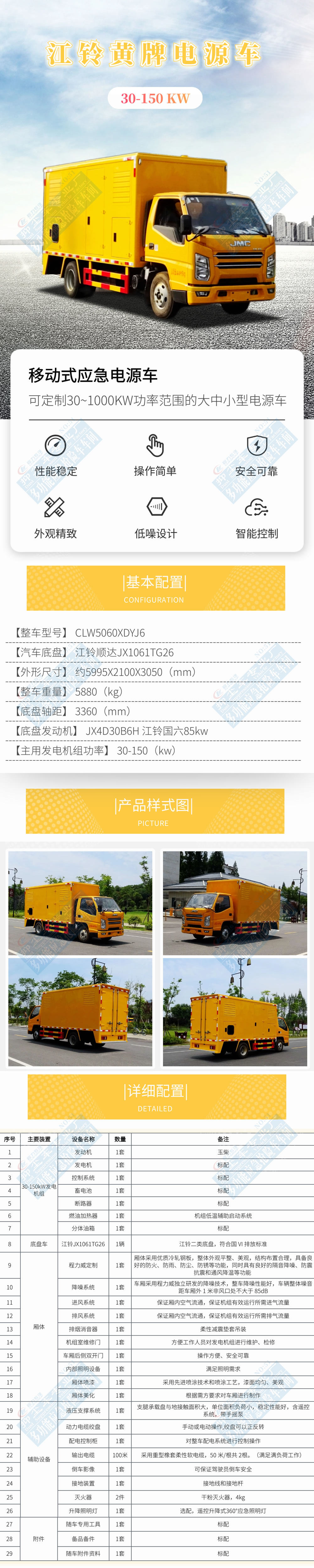 電源車可稱為移動電源車、應急電源車、發(fā)電車。多功能應急電源車是在定型的二類汽車底盤上加裝廂體及發(fā)電機組和電力管理系統(tǒng)的專用車輛,主要用于如果停電將會產(chǎn)生嚴重影響的電力、通信、會議、工程搶險和需要電力保障的等場所,作機動應急備用電源。電源車具有良好的越野性和對各種路面的適應性,適應于全天候的野外露天作業(yè),而且能在高、低溫和沙塵等惡劣的環(huán)境下工作。具有整體性能穩(wěn)定可靠、操作簡便、噪音低、排放性好、維護性好等特點,能很好的滿足戶外作業(yè)和應急供電需要。