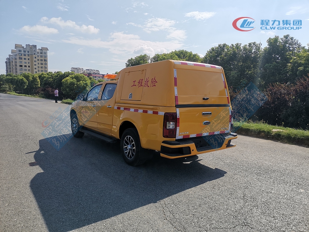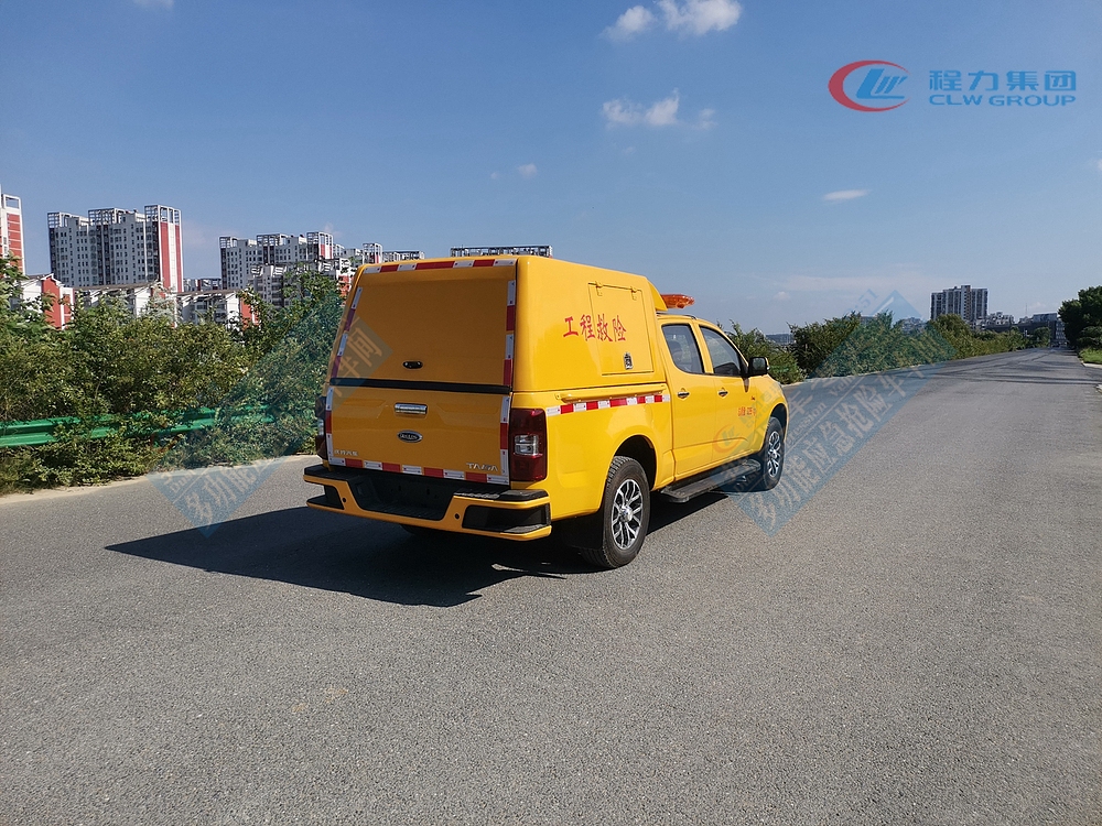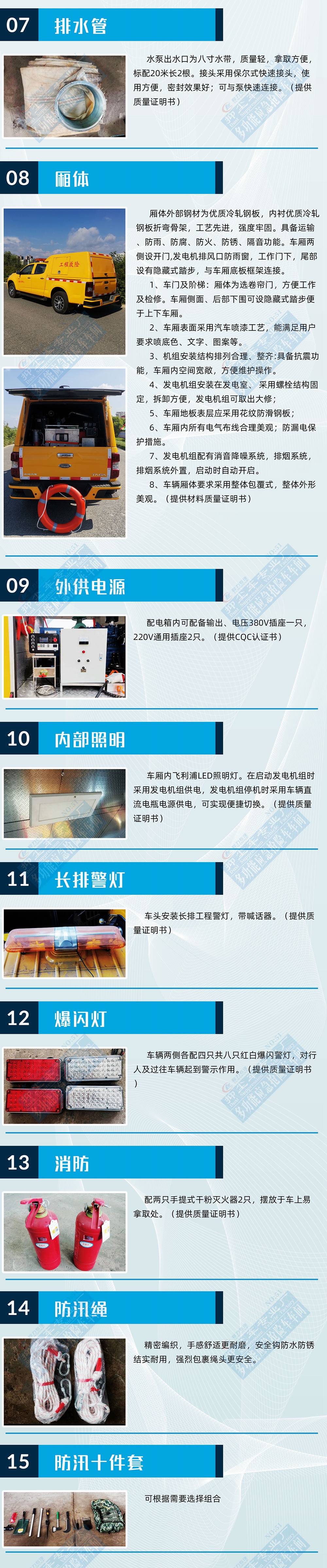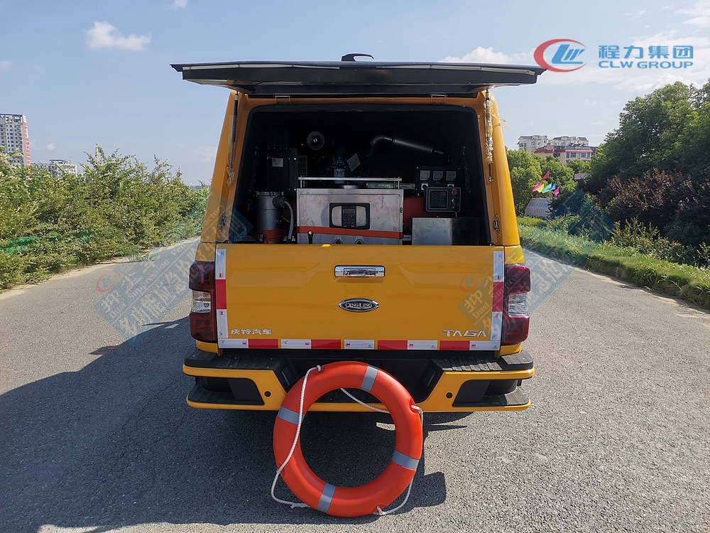 選裝配置:選裝行李架、爬梯、車頂工作臺;選裝不同形狀、結構的警示燈;選裝中隔斷(可選擇開門)、車身兩側可選開上掀門、盲窗、側開門;花紋鋁板;加裝設備工具柜、配電箱、發電機組、水泵、電焊機、空壓機等線路安裝外接電源系統、(室內燈光照明、探照燈、高桿照明燈等);繞線盤,還可根據用戶不同需求加裝不同的維修搶險設備、車身制作專用圖案或標識。