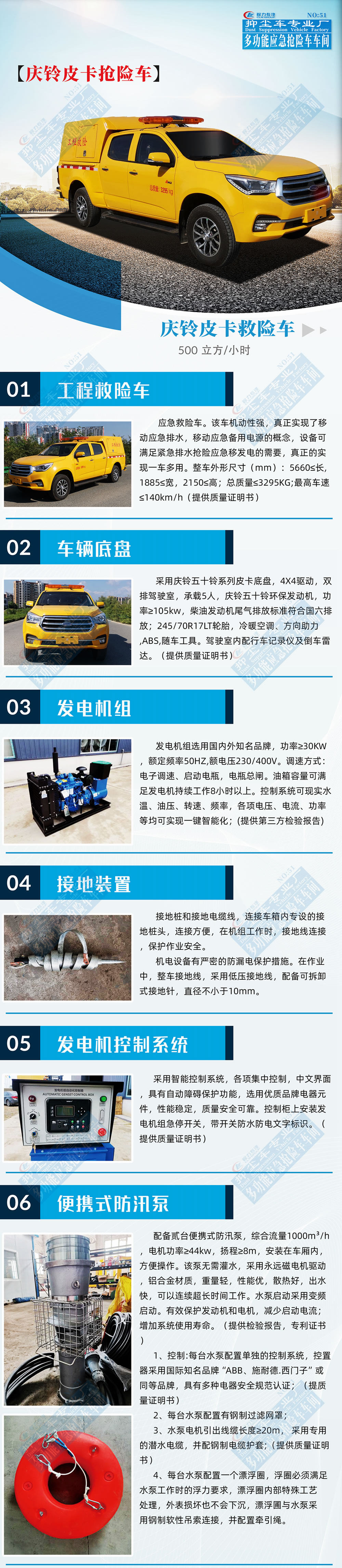 工程救險車配柴油發電機組、移動水泵、控制系統等,可滿足深水區域搶險救援工作,保障城市防汛排水通暢,提高防汛排澇能力,確保汛期群眾生命財產安全和城市道路正常運轉,真正實現了移動水泵的概念,廣泛適用于城市消防領域,排澇、抗旱、礦井搶險、森林消防、高速公路橋梁底涵排水、灌溉等領域。常見應用于無固定泵站,無電源地區排水,城市道路、公路、地鐵隧道排水,消防應急供水防洪搶險,淹沒地區排水,江河湖泊、水庫、海洋水環境治理,農業應急抗旱供水、臨時調水,地下水管爆裂,企業工廠排水排污,特別適用于城市內澇排水搶險。