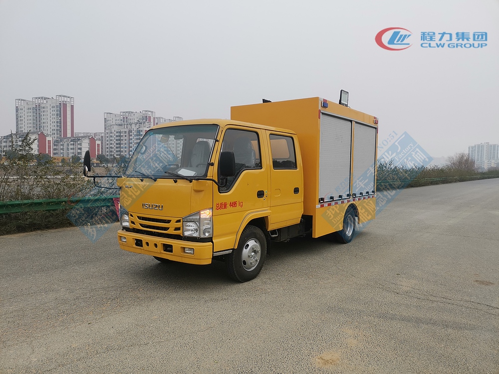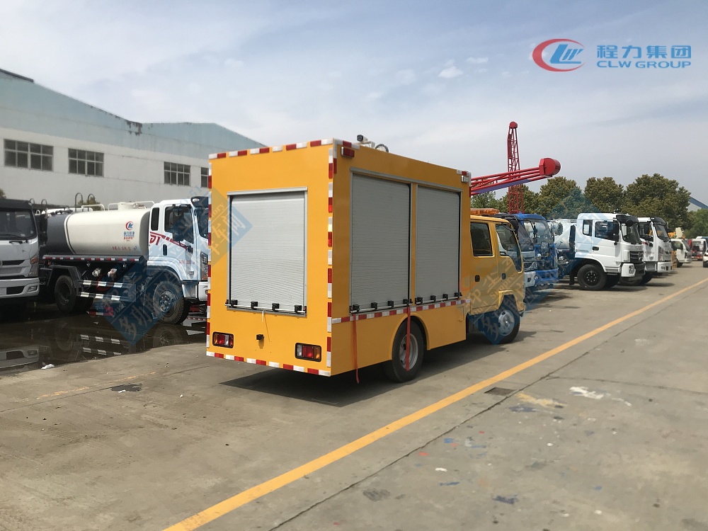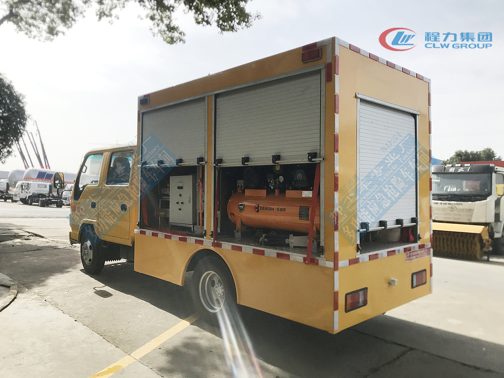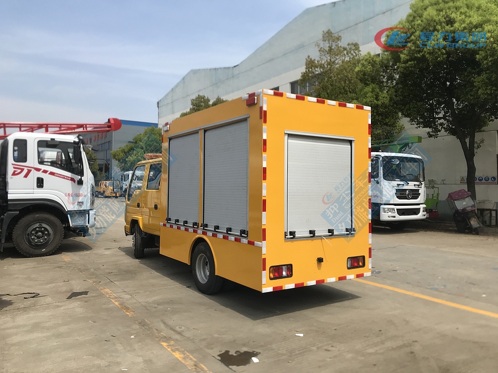 選裝配置:選裝行李架、爬梯、車頂工作臺;選裝不同形狀、結構的警示燈;選裝中隔斷(可選擇開門)、車身兩側可選開上掀門、盲窗、側開門;花紋鋁板;加裝設備工具柜、配電箱、發電機組、水泵、電焊機、空壓機等線路安裝外接電源系統、(室內燈光照明、探照燈、高桿照明燈等);繞線盤,還可根據用戶不同需求加裝不同的維修搶險設備、車身制作專用圖案或標識。