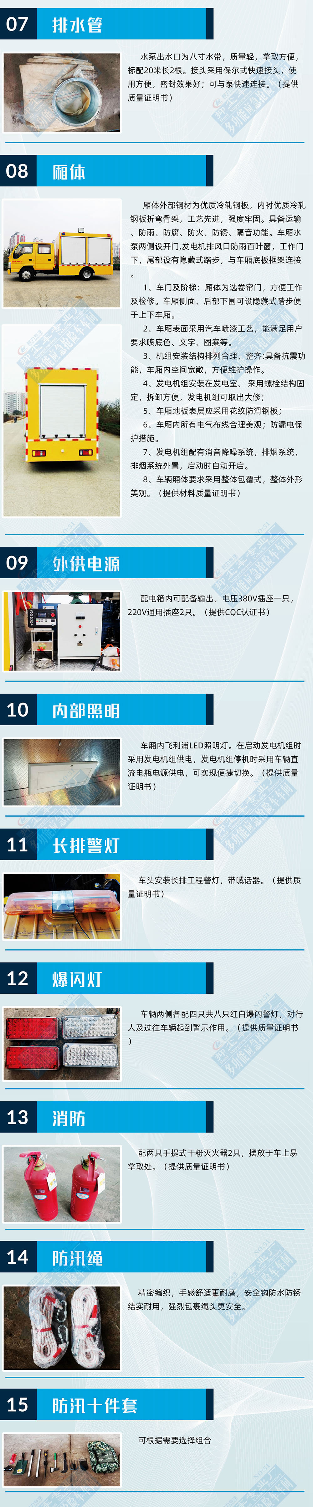 搶險車每臺潛水泵按出水口直徑大小配備20米出水軟管(可選裝加長),軟管為快速接頭連接,操作方便,安全可靠。水管材質為PVC襯里帆布水帶,耐磨,耐壓,快速接頭為不銹鋼制作。
