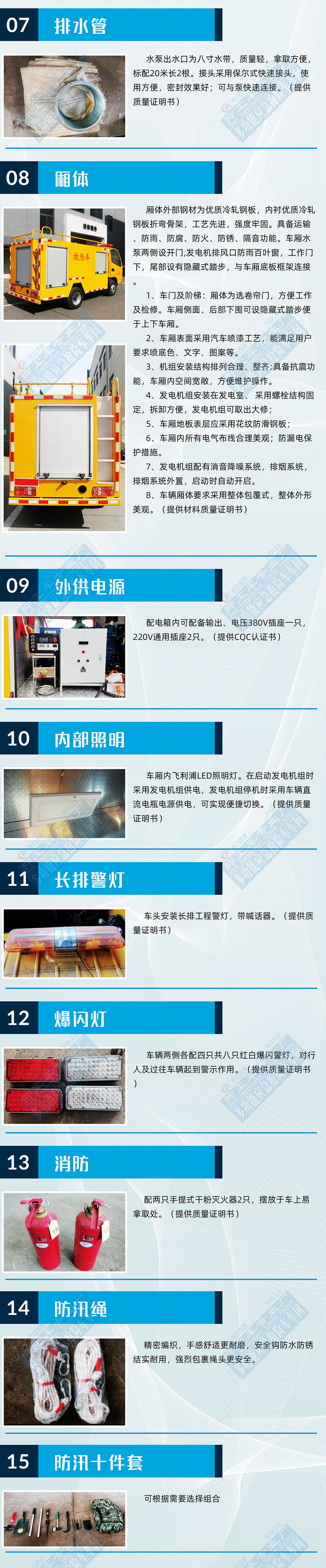 搶險車每臺潛水泵按出水口直徑大小配備20米出水軟管(可選裝加長),軟管為快速接頭連接,操作方便,安全可靠。水管材質(zhì)為PVC襯里帆布水帶,耐磨,耐壓,快速接頭為不銹鋼制作。
