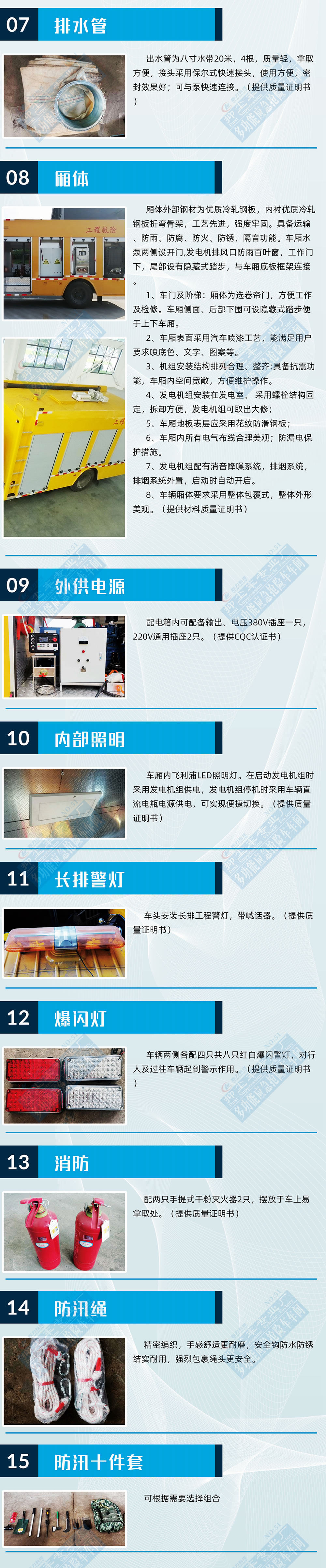 選裝配置:選裝行李架、爬梯、車頂工作臺;選裝不同形狀、結構的警示燈;選裝中隔斷(可選擇開門)、車身兩側可選開上掀門、盲窗、側開門;花紋鋁板;加裝設備工具柜、配電箱、發電機組、水泵、電焊機、空壓機等線路安裝外接電源系統、(室內燈光照明、探照燈、高桿照明燈等);繞線盤,還可根據用戶不同需求加裝不同的維修搶險設備、車身制作專用圖案或標識。