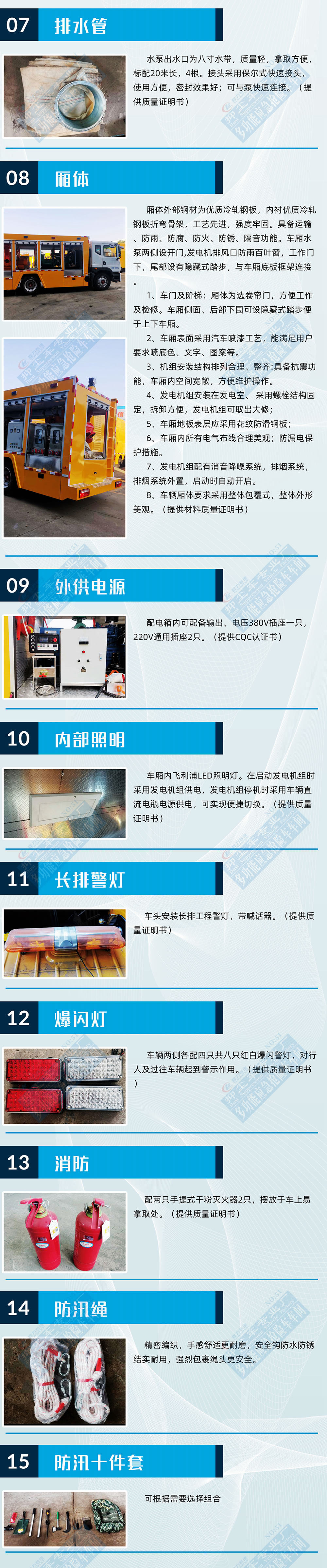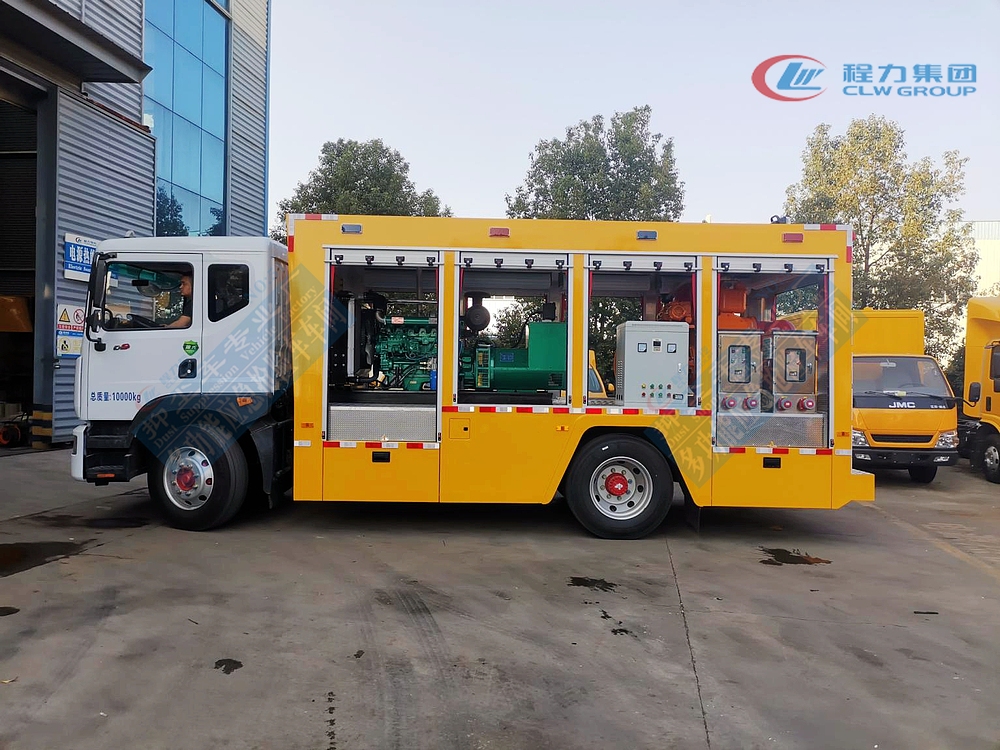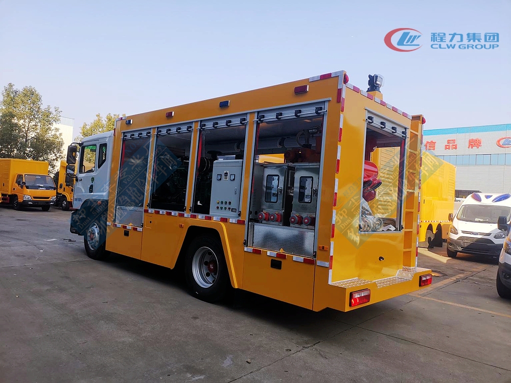 選裝配置:選裝行李架、爬梯、車頂工作臺;選裝不同形狀、結構的警示燈;選裝中隔斷(可選擇開門)、車身兩側可選開上掀門、盲窗、側開門;花紋鋁板;加裝設備工具柜、配電箱、發(fā)電機組、水泵、電焊機、空壓機等線路安裝外接電源系統(tǒng)、(室內燈光照明、探照燈、高桿照明燈等);繞線盤,還可根據用戶不同需求加裝不同的維修搶險設備、車身制作專用圖案或標識。