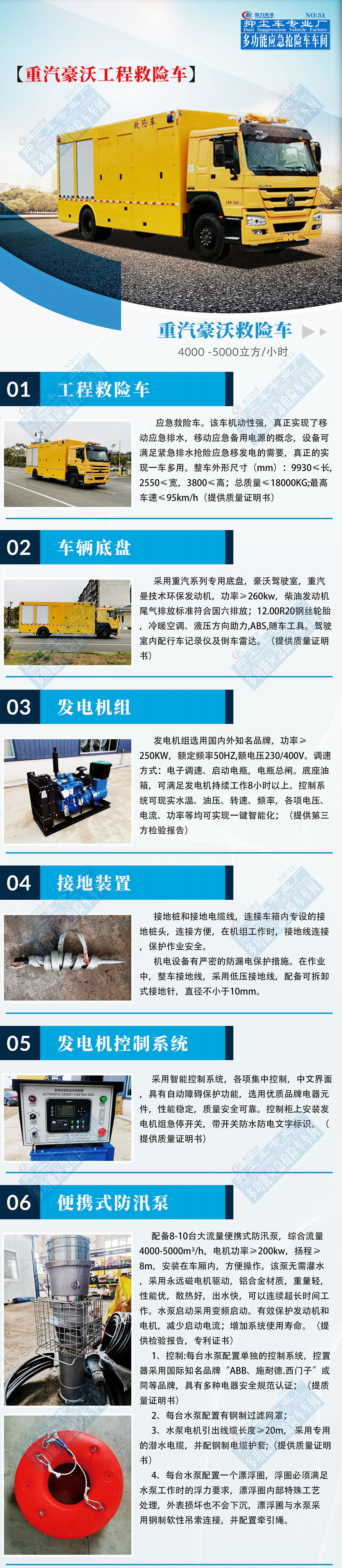 工程救險車配柴油發電機組、移動水泵、控制系統等,可滿足深水區域搶險救援工作,保障城市防汛排水通暢,提高防汛排澇能力,確保汛期群眾生命財產安全和城市道路正常運轉,真正實現了移動水泵的概念,廣泛適用于城市消防領域,排澇、抗旱、礦井搶險、森林消防、高速公路橋梁底涵排水、灌溉等領域。常見應用于無固定泵站,無電源地區排水,城市道路、公路、地鐵隧道排水,消防應急供水防洪搶險,淹沒地區排水,江河湖泊、水庫、海洋水環境治理,農業應急抗旱供水、臨時調水,地下水管爆裂,企業工廠排水排污,特別適用于城市內澇排水搶險。