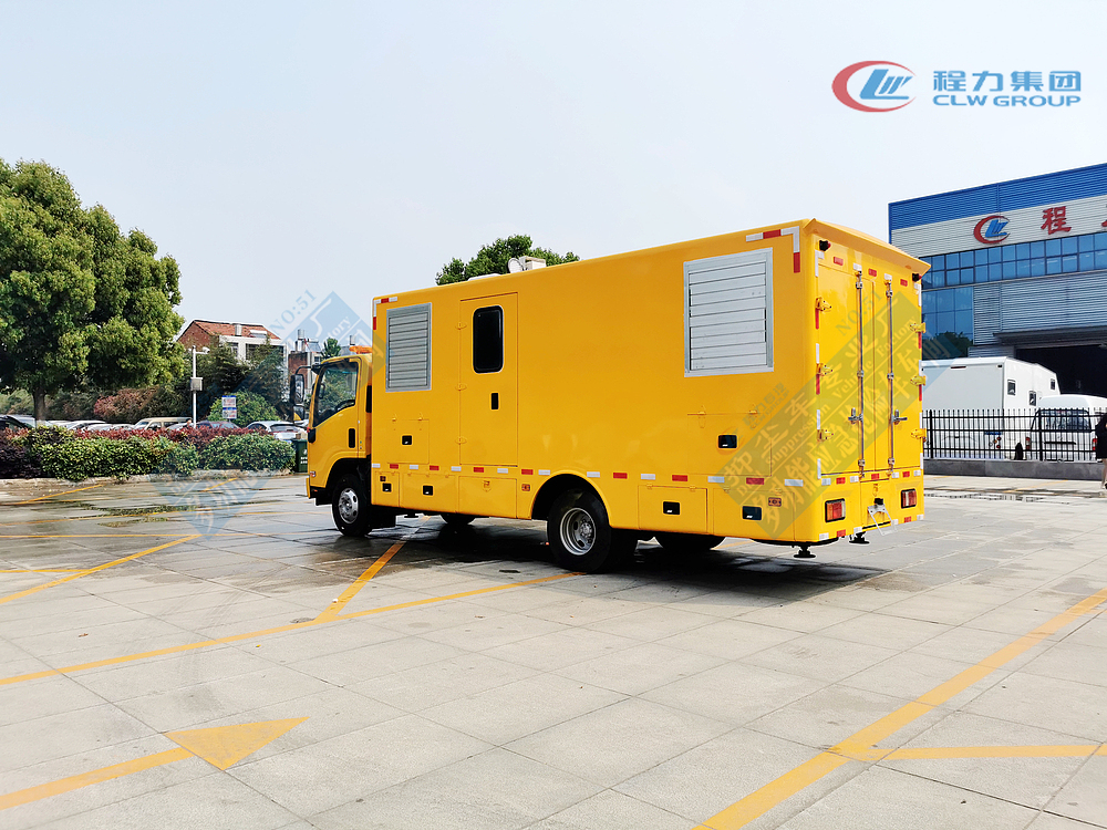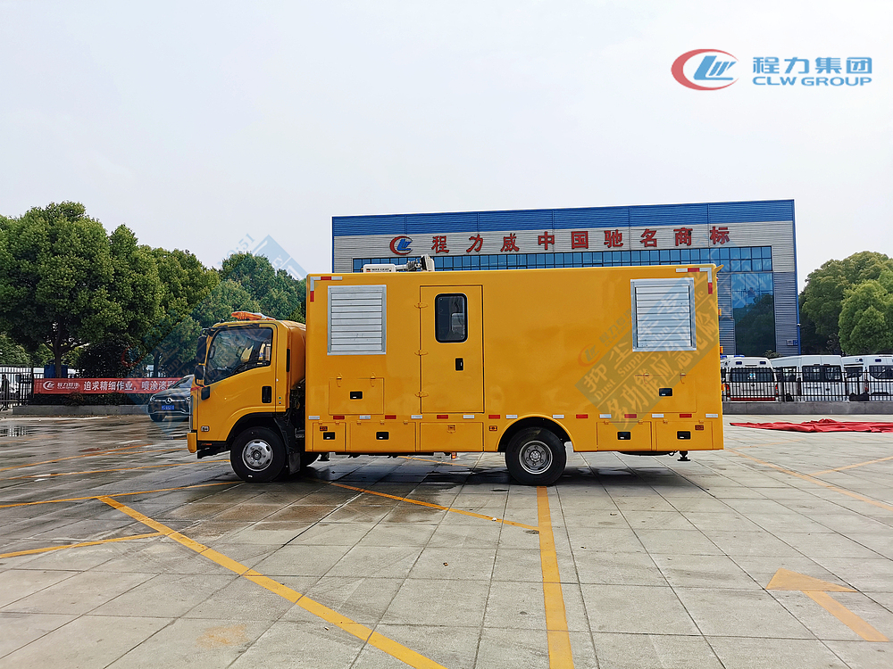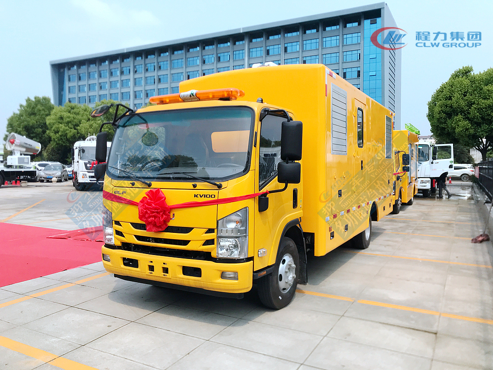 應急電源車主要由二類底盤、隔音降噪廂體、電源系統、電纜絞盤、液壓支腿、動力電纜、照明系統、接地釬和消防安全設施等組成的電源保障車輛,具有良好的機動越野性和對各種路面的適應性,適應于全天候的野外露天作業,具有整體性能穩定可靠、操作簡便、噪音低、排放性好、維護性好等特點,能很好的滿足戶外作業和應急供電需要。